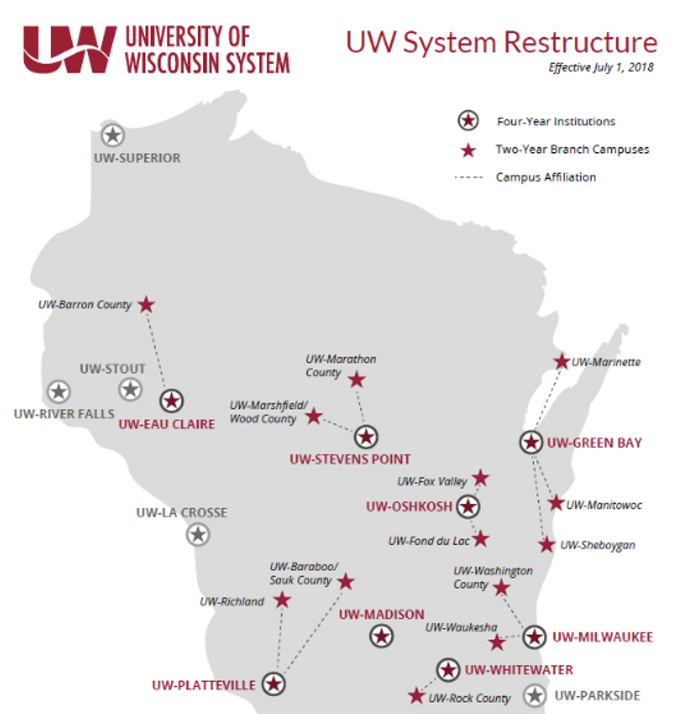 위스콘신 주립대 시스템은 미국에서 가장 큰 규모를 가진 주립대 시스템 중 하나이며 13개의 4년제 대학으로 구성되어 총 18만명 정도의 학생이 이 시스템을 통해 교육을 받고 있습니다.