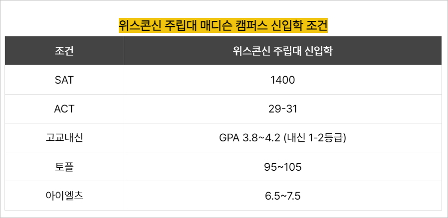 그렇다면 위스콘신 주립대 매디슨 캠퍼스의 신입학 조건은 어떻게 될까요? 전공마다 조금씩 상이하지만 신입생 평균 합격 성적은 아래의 표와 같이 SAT 성적 1400 이상, ACT 성적 29-31 이상, 고교내신 GPA 3.8~4.2 (한국 내신으로는 1-2등급), 토플 95~105, 아이엘츠 6.5~7.5 정도로 입학 조건이 매우 높습니다.