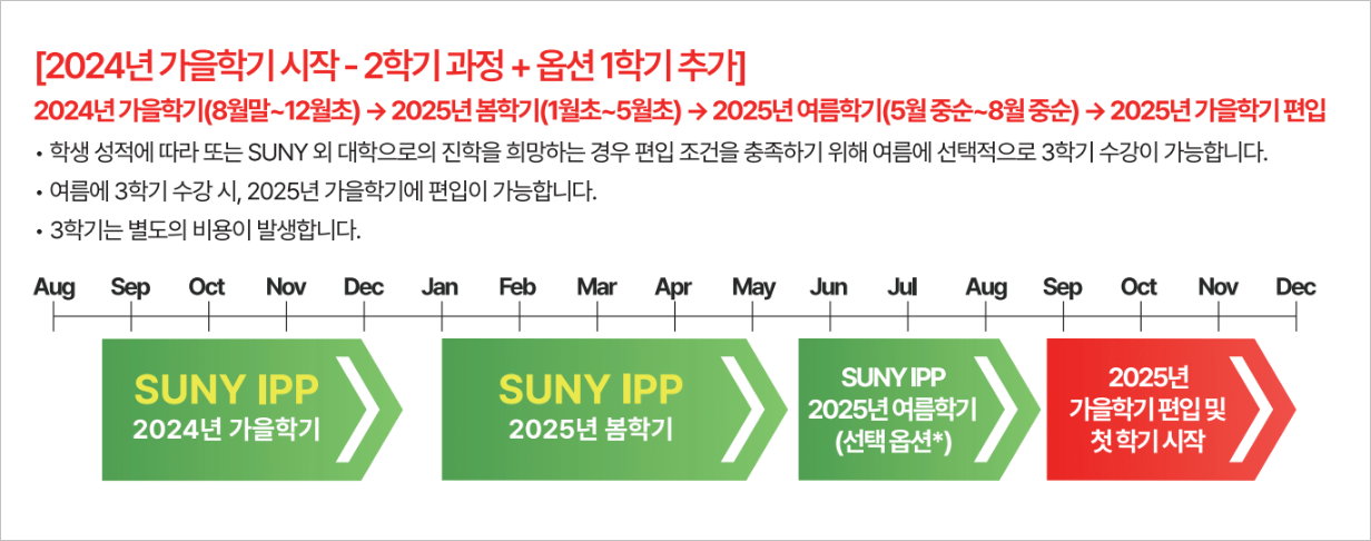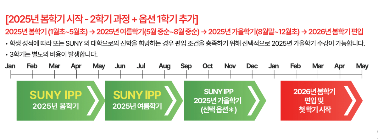2025년 봄학기에 SUNY IPP 프로그램을 시작해서 2025년 여름학기에 SUNY IPP의 두 번째 학기를 마친 경우에도 옵션 1학기 추가가 가능합니다.