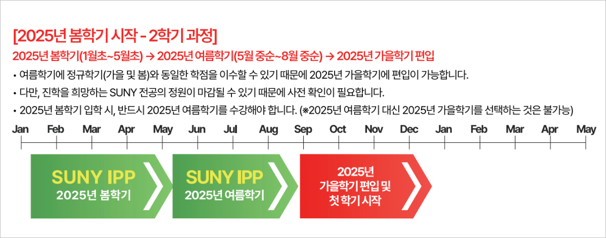 2025년 가을학기에 편입을 시작하고 싶다면 2025년 봄학기와 2025년 여름학기에 SUNY IPP 프로그램을 연속으로 수강한 후 바로 입학하는 것 또한 가능합니다.