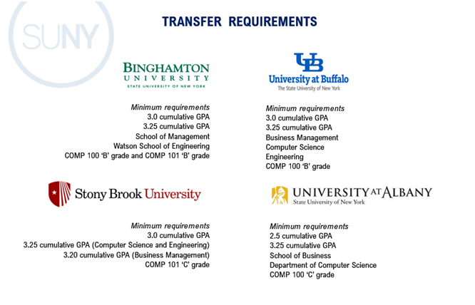 학교나 학과마다 요구하는 진학 조건이 다른데요, 예를 들어서 스토니 브룩 대학교의 컴퓨터공학과(Computer Science and Engineering)에 입학하기 위해서는 평균 GPA가 최소 3.25가 나와야 하며 작문 과목 중 하나인 COMP 101에서 C 등급을 받아야 합니다.