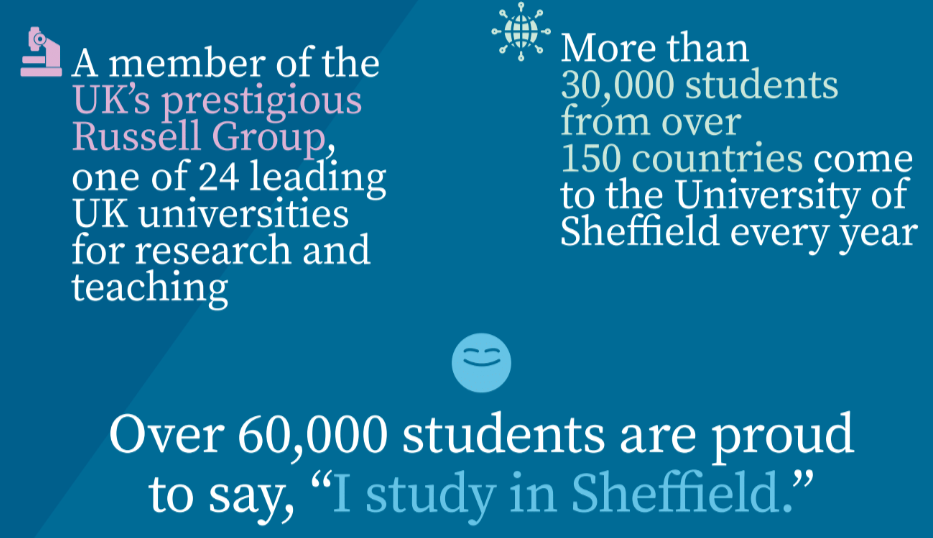*출처 : 셰필드 대학교 공식 홈페이지 학생들의 도시셰필드는 잉글랜드에서 다섯 번째로 큰 도시로, 약 56만 4천 명의 인구 중 약 6만 명이 학생입니다.